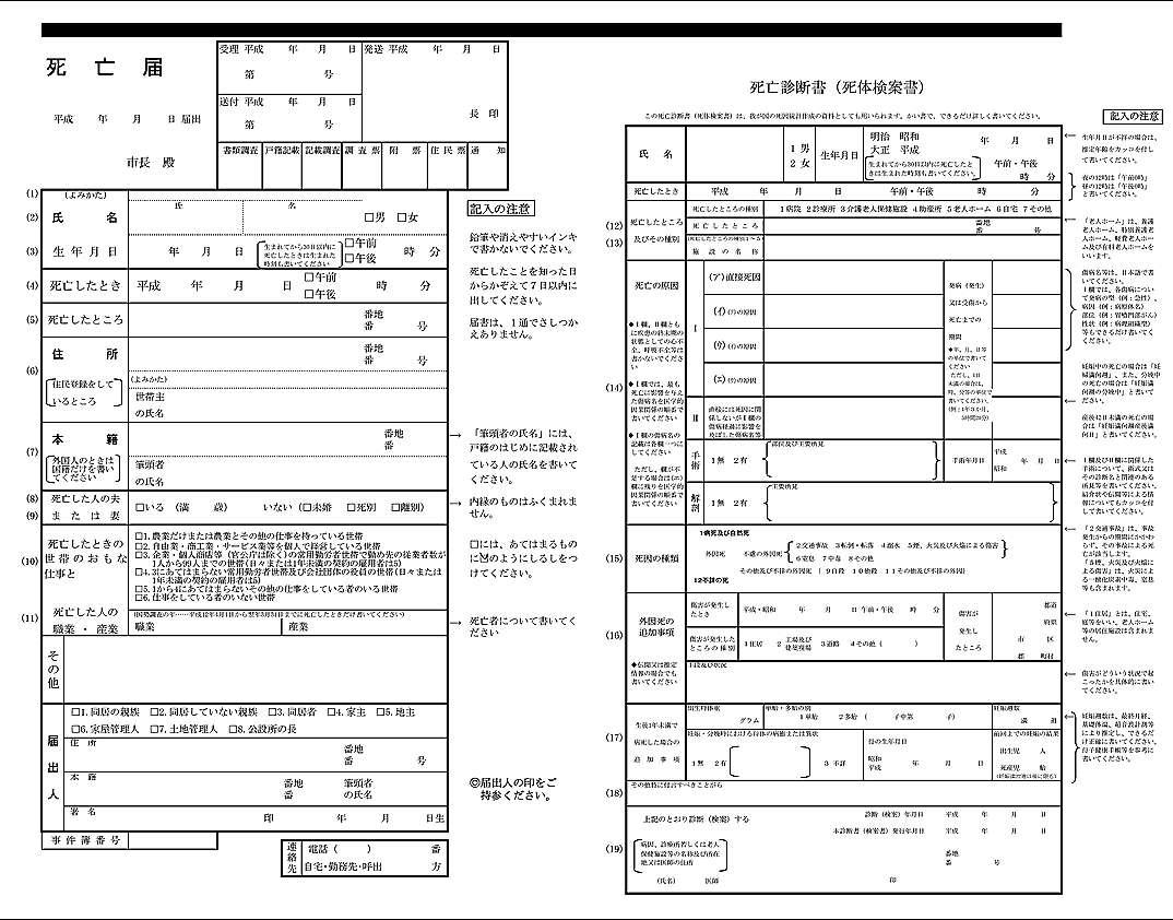 委任者様がお亡くなりになったときには、臨終に立ち会った医師や死亡を確認した医師から「死亡診断書」を交付してもらいます。診察にかかっていた病気以外の理由により亡くなられたときには「死体検案書」、不慮の事故によりお亡くなりになった時は警察に連絡し、医師(監察医)から「死体検案書」を交付してもらいます。