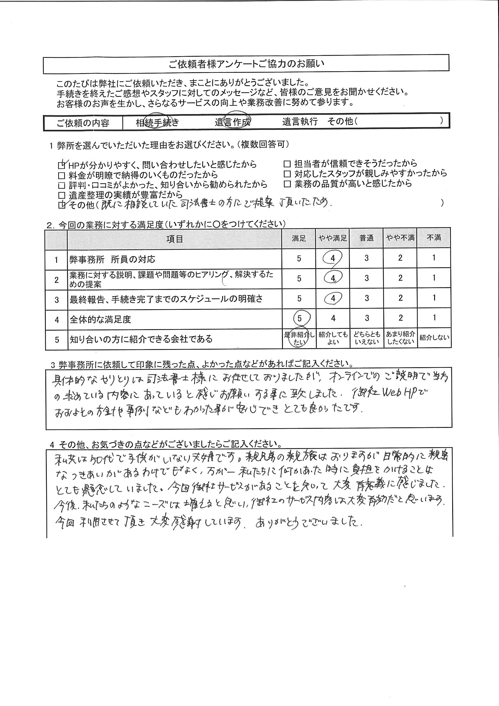 具体的なやり取りは司法書士様にお任せしておりましたが、オンラインでのご説明で当方の求めている内容にあっていると感じお願いすることに致しました。御社WebHPでおおよその方針や事例なども分かったことが安心できとても良かったです。