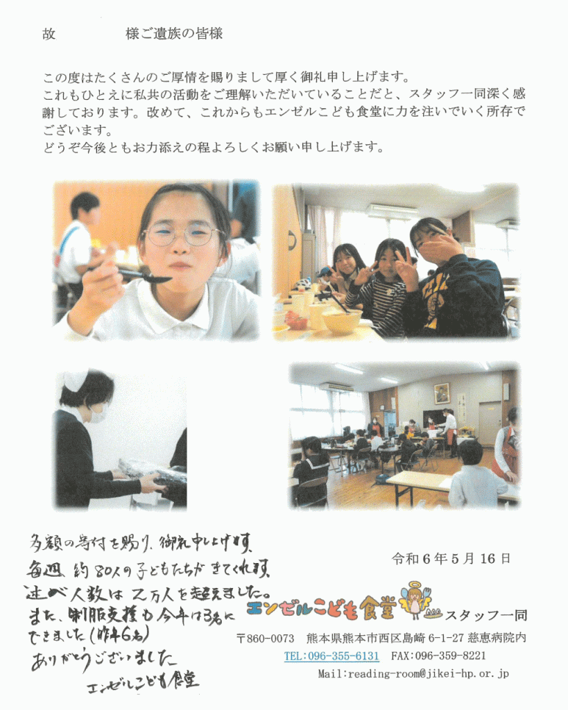 遺贈寄付を受けた団体様よりご遺族の方へお礼状が届きました